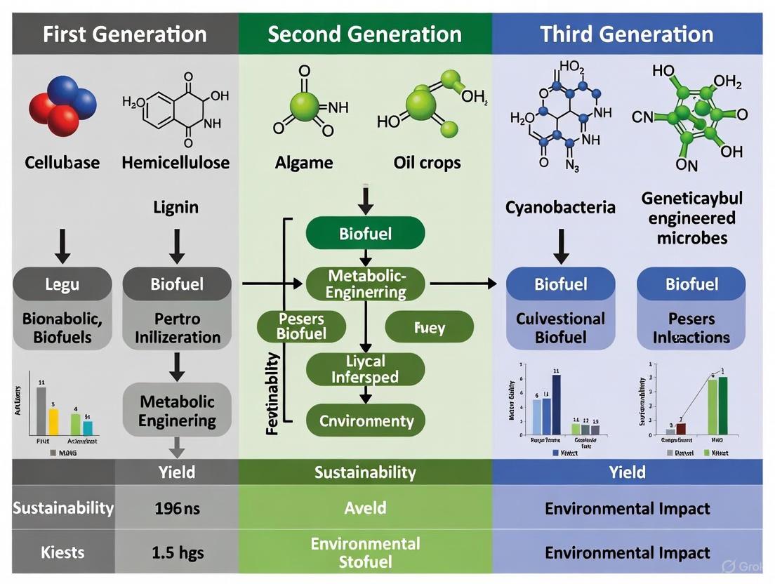 The generational evolution of biofuels represents a clear trajectory toward greater sustainability, moving from the contentious food-crop-based first generation to the more promising waste-based and algal systems of the second and third generations. While first-generation biofuels established the market, their environmental trade-offs are significant. Second-generation biofuels offer a superior sustainability profile by utilizing non-food biomass but face steep economic and technical hurdles to reach commercial scale. Third-generation algae-based fuels present the most compelling long-term potential for minimal land use and high yields, though they remain in earlier stages of development. For researchers and policymakers, the path forward must involve continued R&D to overcome processing challenges, robust lifecycle assessments to validate environmental claims, and supportive policies that incentivize the most sustainable and technologically advanced biofuel pathways to ensure a truly low-carbon energy future.