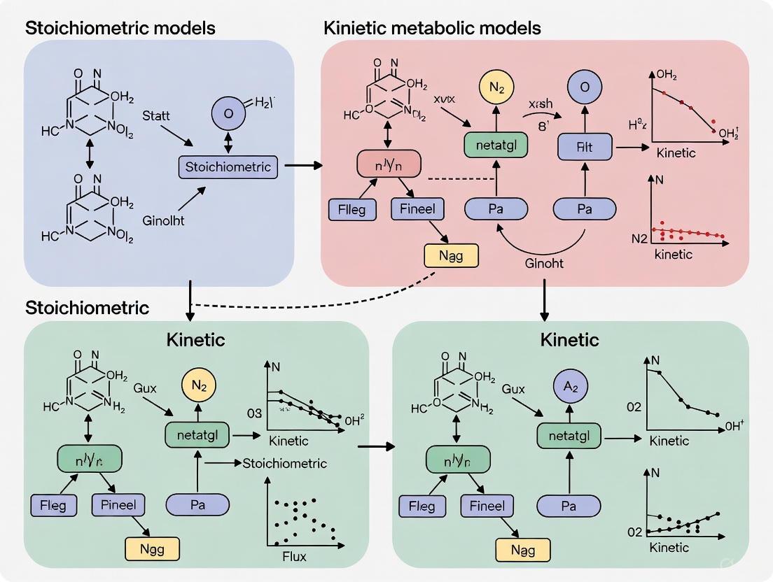 Stoichiometric and kinetic models represent two fundamentally different approaches to metabolic modeling, each with distinct strengths, limitations, and application domains. Understanding these differences is crucial for selecting the appropriate modeling framework for a specific research question.